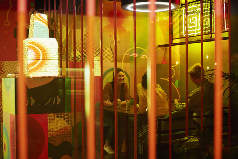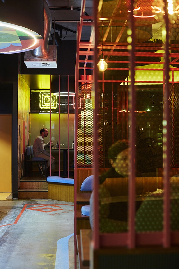 Cylindrical forms are layered across the ceiling in an array of black exteriors with hollow interiors of block colour, colour graphic, or LED lighting. Bright pink steel framing dances around the room as partitions and a cage-like ceiling. Pink and yellow Perspex, perforated screens, blue upholstery and neon lighting is scattered throughout the interior, resulting in a fit-out that is bold and dares to be different.