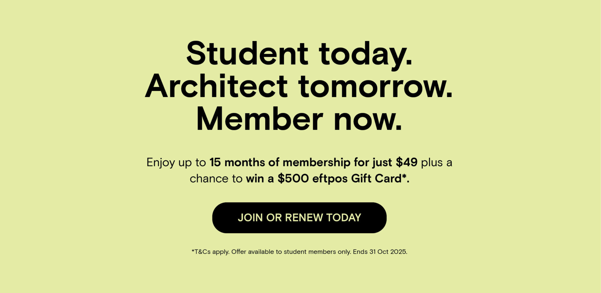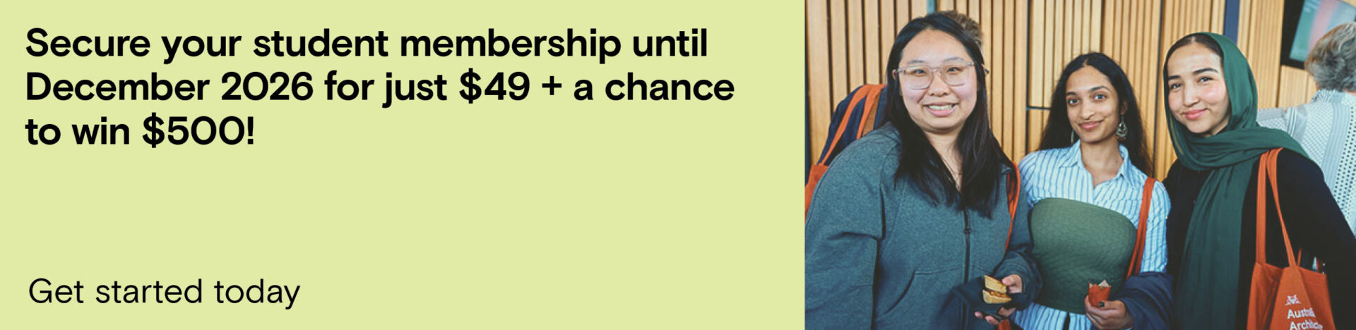 - Students enrolled in a Bachelor’s or Master’s program in a recognised architecture course or a related course to architecture in Australia e.g. Landscape architecture, engineering, interior design