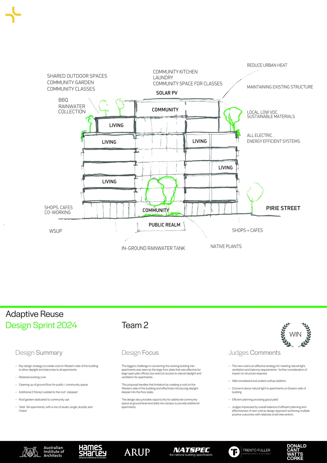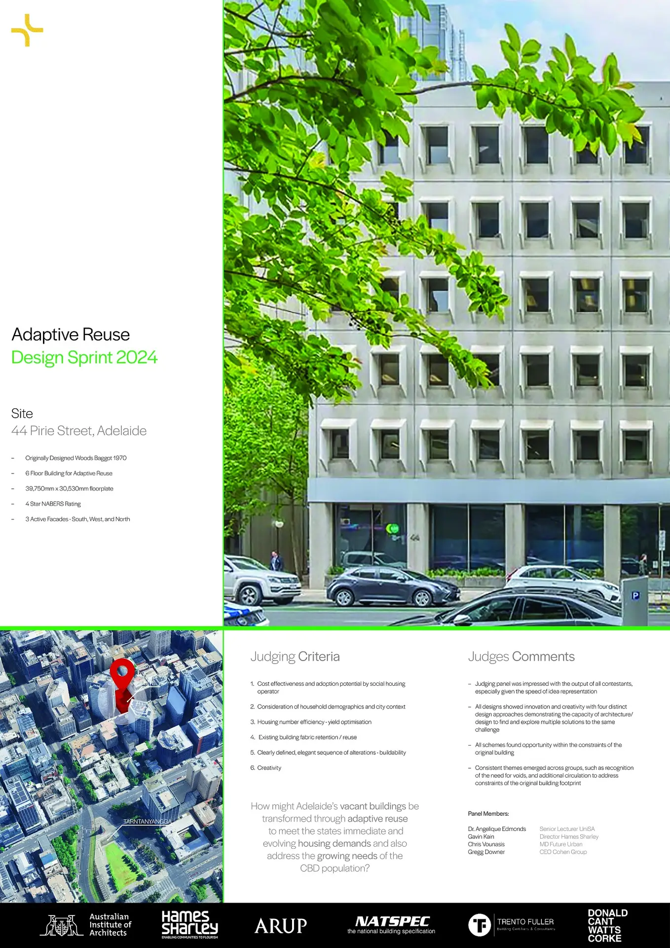 Centred around the repurposing of 44 Pirie Street – a 1970s office building designed by Woods Bagot – the Sprint invited participants to consider how adaptive reuse could address urgent housing demand, growing city population needs, and environmental imperatives. Over a condensed timeframe, teams developed innovative proposals judged on criteria including cost-effective housing outcomes, social and urban context, buildability, creativity, and celebration of the existing building fabric.